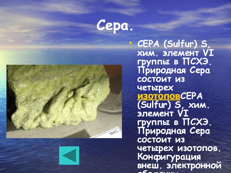 Сера.СЕРА (Sulfur) S, хим. элемент VI группы в ПСХЭ. Природная Сера состоит из четырех изотоповСЕРА (Sulfur) S,