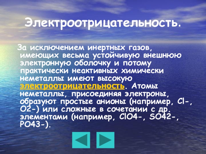 Электроотрицательность.  За исключением инертных газов, имеющих весьма устойчивую внешнюю электронную оболочку и потому практически неактивных химически неметаллы