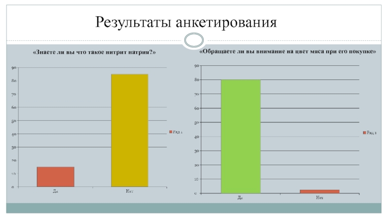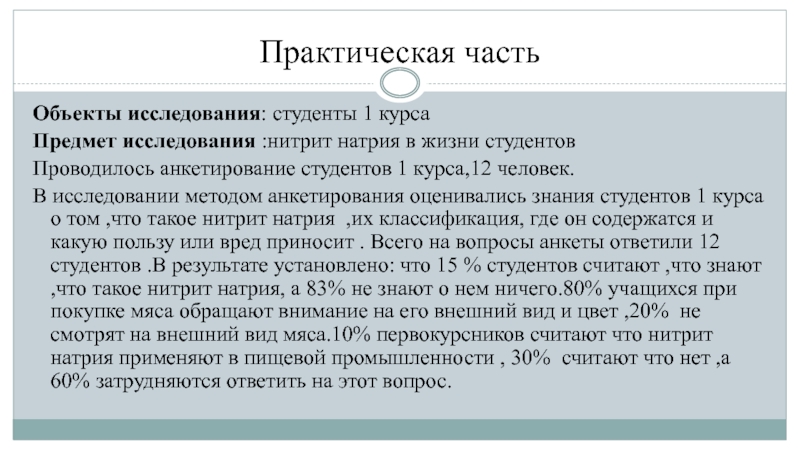 В исследовании методом анкетирования оценивались знания студентов 1 курса о том ,что такое нитрит натрия ,их классификация, где он содержатся и какую пользу или вред приносит . Всего на вопросы анкеты ответили 12 студентов .В результате установлено: что 15 % студентов считают ,что знают ,что такое нитрит натрия, а 83% не знают о нем ничего.80% учащихся при покупке мяса обращают внимание на его внешний вид и цвет ,20% не смотрят на внешний вид мяса.10% первокурсников считают что нитрит натрия применяют в пищевой промышленности , 30% считают что нет ,а 60% затрудняются ответить на этот вопрос.