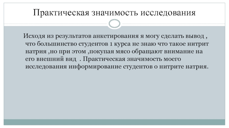 , что большинство студентов 1 курса не знаю что такое нитрит натрия ,но при этом ,покупая мясо обращают внимание на его внешний вид . Практическая значимость моего исследования информирование студентов о нитрите натрия.