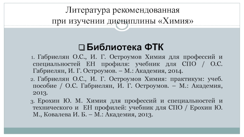 Г. Остроумов Химия для профессий и специальностей ЕН профиля: учебник для СПО / О.С. Габриелян, И. Г. Остроумов. – М.: Академия, 2014.
