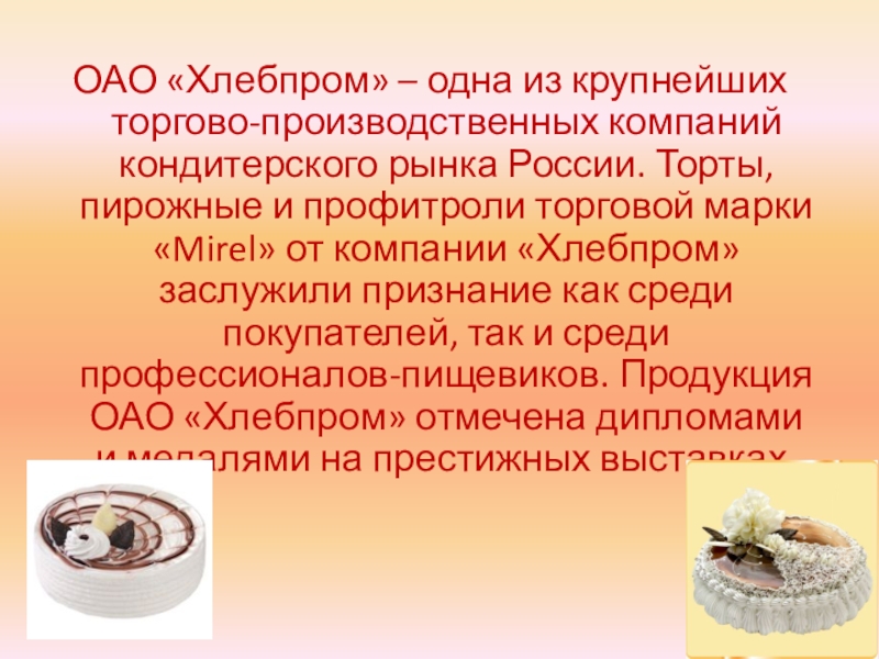 Торты, пирожные и профитроли торговой марки «Mirel» от компании «Хлебпром» заслужили признание как среди покупателей, так и среди профессионалов-пищевиков. Продукция ОАО «Хлебпром» отмечена дипломами и медалями на престижных выставках.