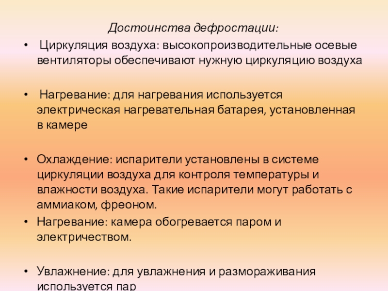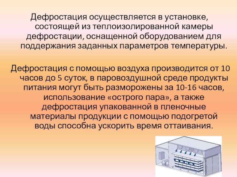 Слайд 13Дефростация осуществляется в установке, состоящей из теплоизолированной камеры дефростации, оснащенной оборудованием