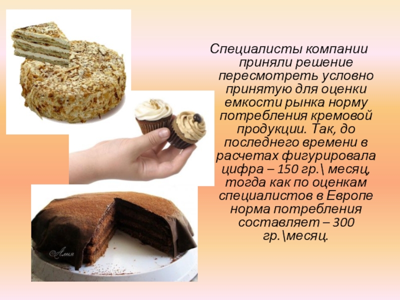 норму потребления кремовой продукции. Так, до последнего времени в расчетах фигурировала цифра – 150 гр.\ месяц, тогда как по оценкам специалистов в Европе норма потребления составляет – 300 гр.\месяц.