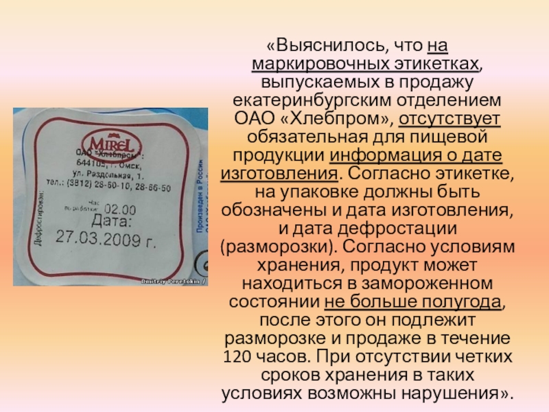 Слайд 11«Выяснилось, что на маркировочных этикетках, выпускаемых в продажу екатеринбургским отделением ОАО