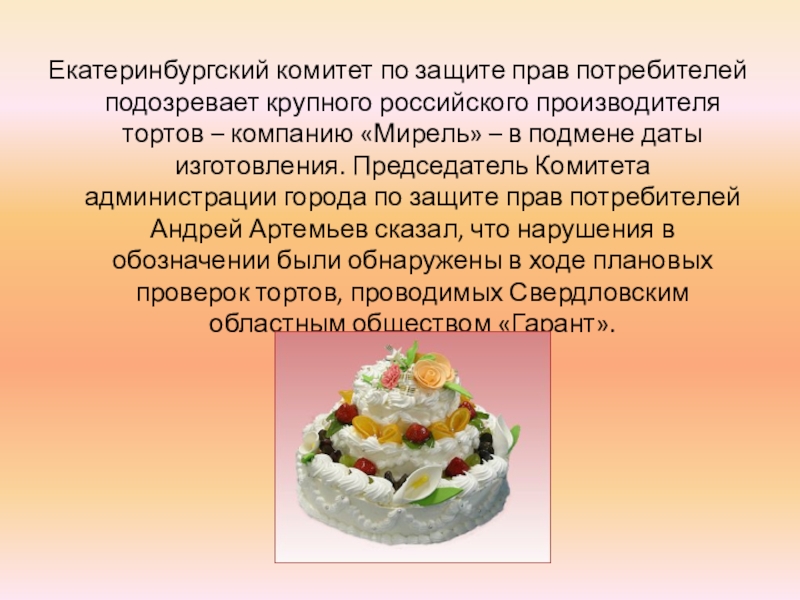 – компанию «Мирель» – в подмене даты изготовления. Председатель Комитета администрации города по защите прав потребителей Андрей Артемьев сказал, что нарушения в обозначении были обнаружены в ходе плановых проверок тортов, проводимых Свердловским областным обществом «Гарант».