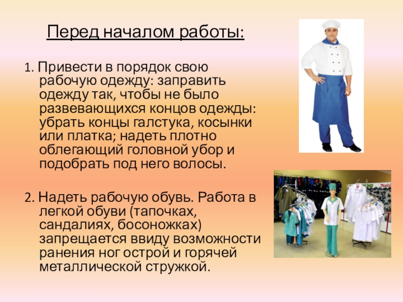 1. Привести в порядок свою рабочую одежду: заправить одежду