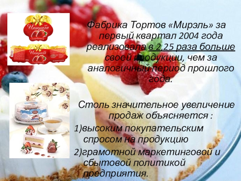 Фабрика Тортов «Мирэль» за первый квартал 2004 года реализовала в