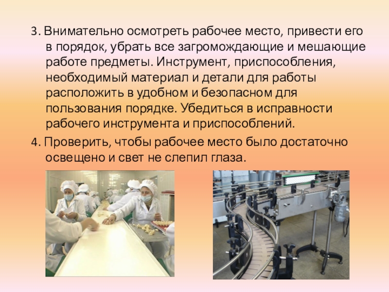 загромождающие и мешающие работе предметы. Инструмент, приспособления, необходимый материал и детали для работы расположить в удобном и безопасном для пользования порядке. Убедиться в исправности рабочего инструмента и приспособлений.