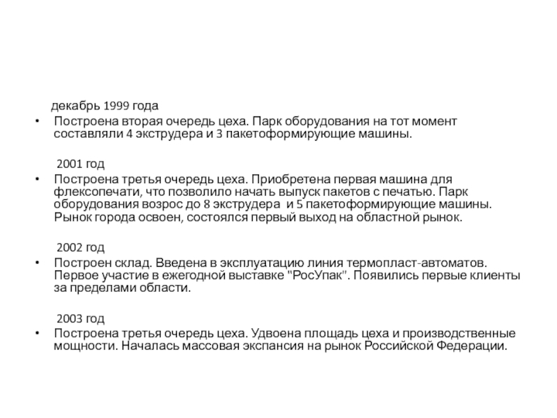 декабрь 1999 годаПостроена вторая очередь цеха. Парк оборудования на тот момент составляли 4