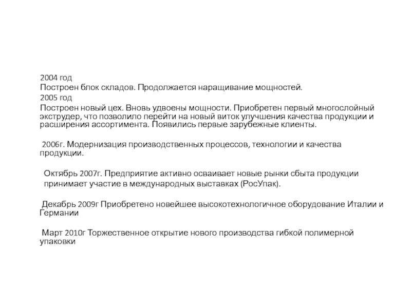 2004 год    Построен блок складов. Продолжается наращивание мощностей.