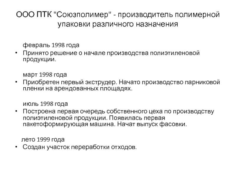 оборудования на тот момент составляли 4 экструдера и 3 пакетоформирующие машины.