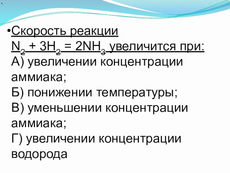 .  Скорость реакции N2 + 3H2 = 2NH3 увеличится при:А) увеличении концентрации аммиака;Б) понижении температуры;В) уменьшении