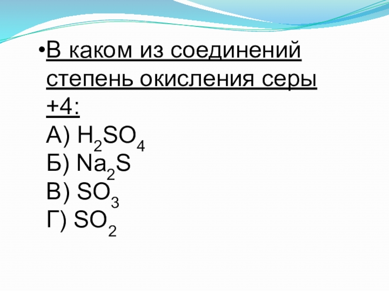 В каком из соединений степень окисления серы +4:А) H2SO4    Б) Na2S