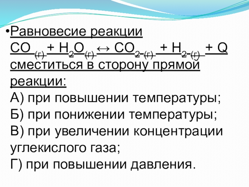 Равновесие реакции CO (г) + H2O(г) ↔ СО2 (г) + Н2 (г) + Q  сместиться в