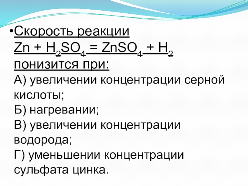 Скорость реакции Zn + H2SO4 = ZnSO4 + H2 понизится при:А) увеличении концентрации серной кислоты;Б) нагревании;В) увеличении