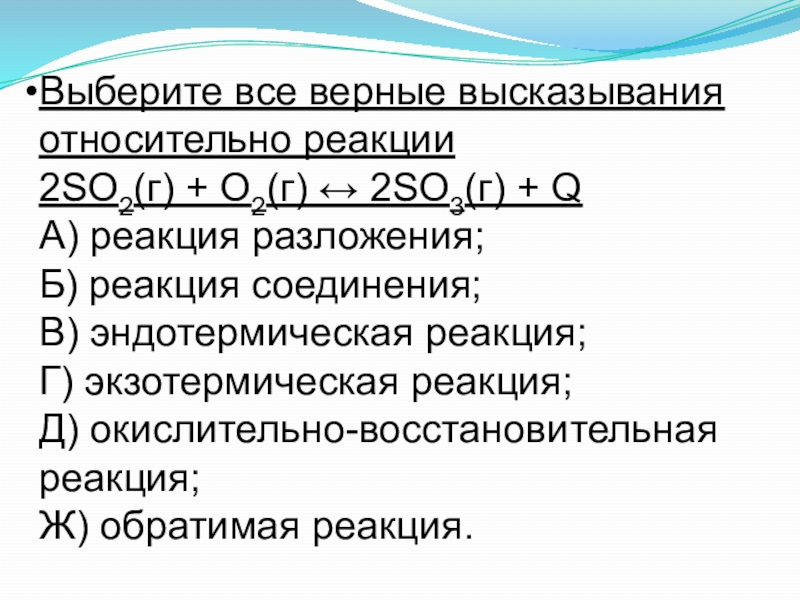 Выберите все верные высказывания относительно реакции2SO2(г) + О2(г) ↔ 2SO3(г) + QА) реакция разложения;Б) реакция соединения;В) эндотермическая
