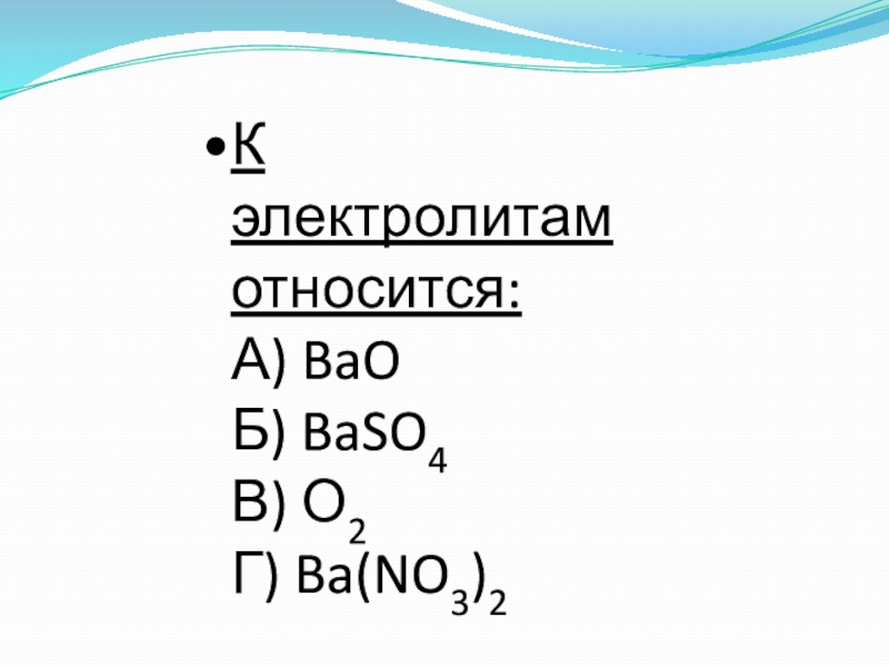 К электролитам относится:А) BaO Б) BaSO4 В) О2 Г) Ba(NO3)2