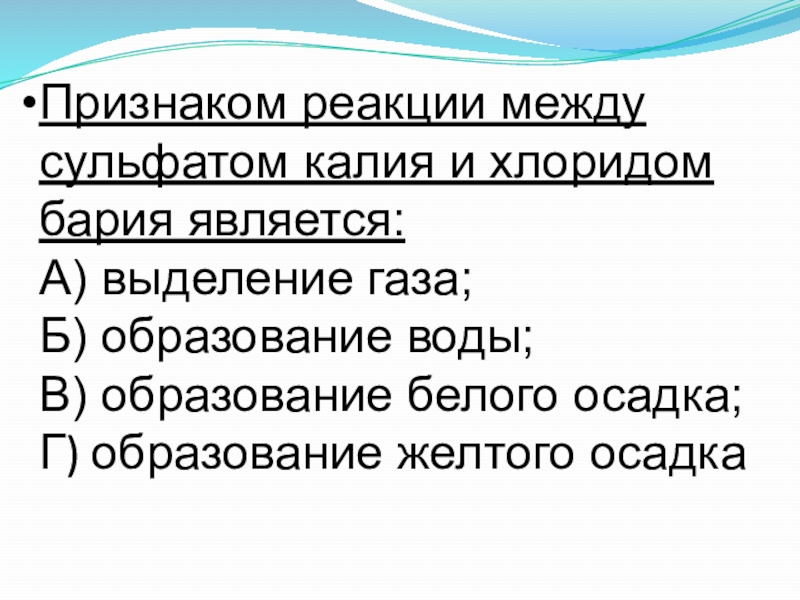 Признаком реакции между сульфатом калия и хлоридом бария является:А) выделение газа;Б) образование воды;В) образование белого осадка;Г) образование