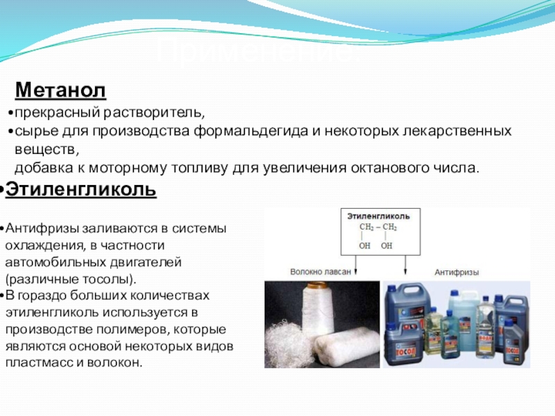 В гораздо больших количествах этиленгликоль используется в производстве полимеров, которые являются основой некоторых видов пластмасс и волокон.