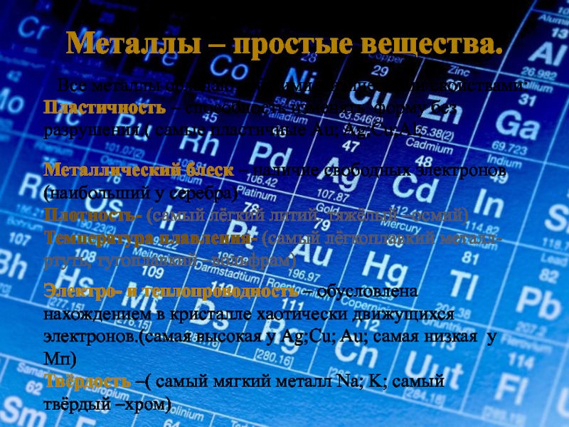 Твёрдость –( самый мягкий металл Na; K; самый твёрдый –хром)