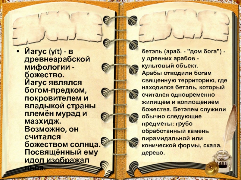Арабы отводили богам священную территорию, где находился бетэль, который считался одновременно жилищем и воплощением божества. Бетэлем служили обычно следующие предметы: грубо обработанный камень пирамидальной или конической формы, скала, дерево.