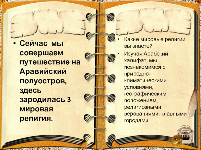 Изучая Арабский халифат, мы познакомимся с природно-климатическими условиями, географическим положением, религиозными верованиями, главными городами.