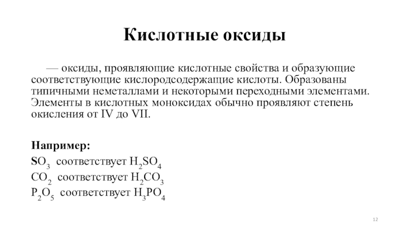 Кислотные оксиды	— оксиды, проявляющие кислотные свойства и образующие соответствующие кислородсодержащие кислоты. Образованы типичными неметаллами и некоторыми переходными элементами. Элементы