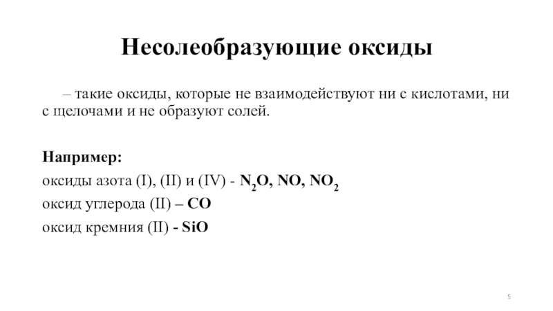 Несолеобразующие оксиды	– такие оксиды, которые не взаимодействуют ни с кислотами, ни с щелочами и не образуют солей.Например:oксиды