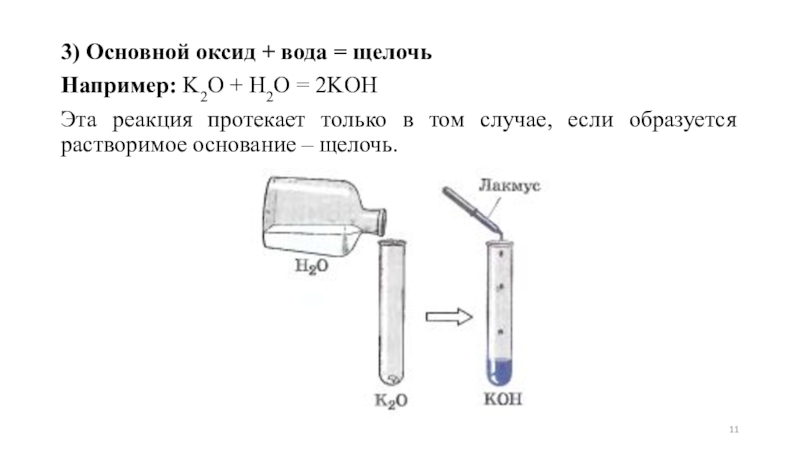 3) Основной оксид + вода = щелочьНапример: K2O + H2O = 2KOHЭта реакция протекает только в том
