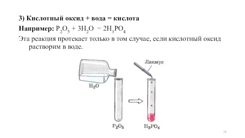 3) Кислотный оксид + вода = кислотаНапример: P2O5 + 3H2O = 2H3PO4Эта реакция протекает только в том