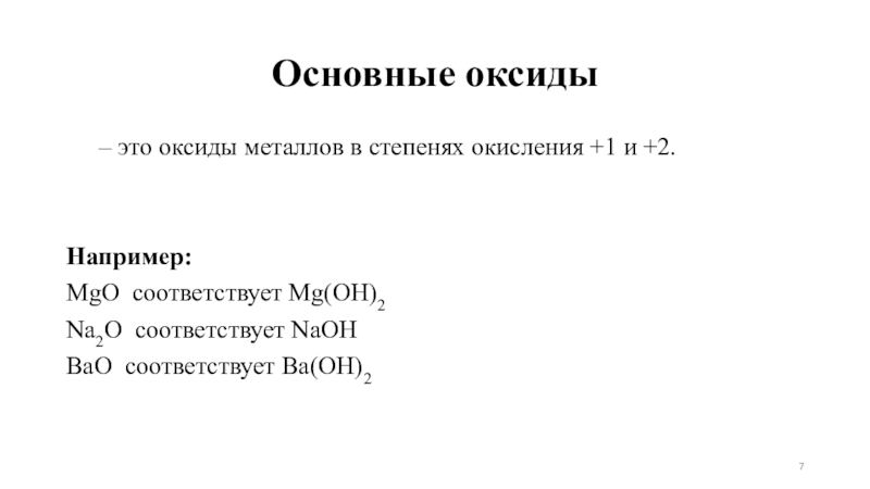 Основные оксиды	– это оксиды металлов в степенях окисления +1 и +2.Например:MgO соответствует Mg(OH)2Na2O соответствует NaOHBaO соответствует Ba(OH)2