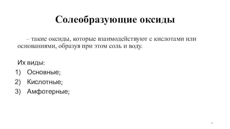 Солеобразующие оксиды	– такие оксиды, которые взаимодействуют с кислотами или основаниями, образуя при этом соль и воду.