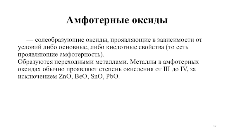 Амфотерные оксиды	— солеобразующие оксиды, проявляющие в зависимости от условий либо основные, либо кислотные свойства (то есть проявляющие амфотерность). 	Образуются переходными металлами.