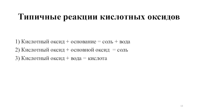 Типичные реакции кислотных оксидов1) Кислотный оксид + основание = соль + вода2) Кислотный оксид + основной оксид