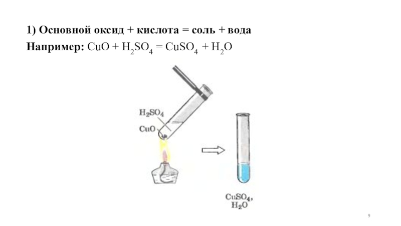 1) Основной оксид + кислота = соль + водаНапример: CuO + H2SO4 = CuSO4 + H2O