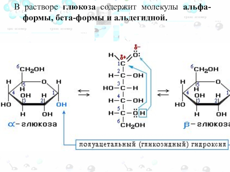 Слайд 99В растворе глюкоза содержит молекулы альфа-формы, бета-формы и альдегидной.