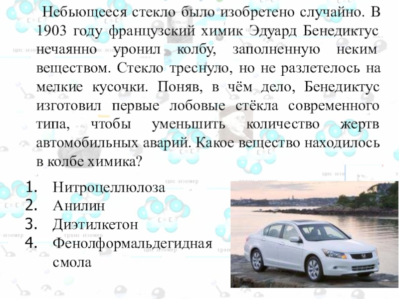 Слайд 110 Небьющееся стекло было изобретено случайно. В 1903 году французский