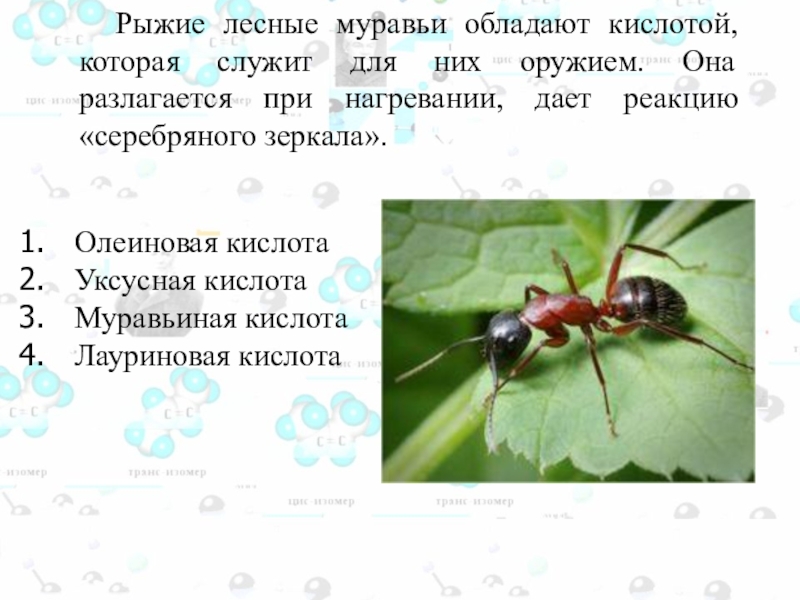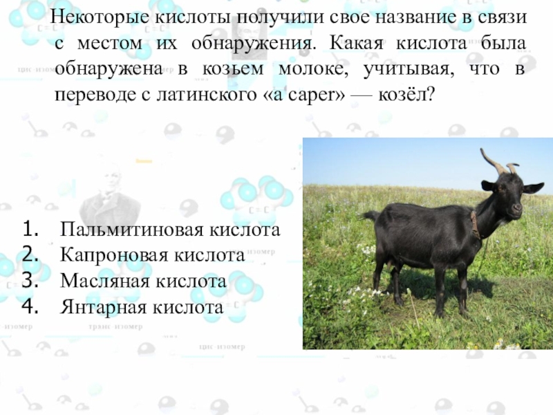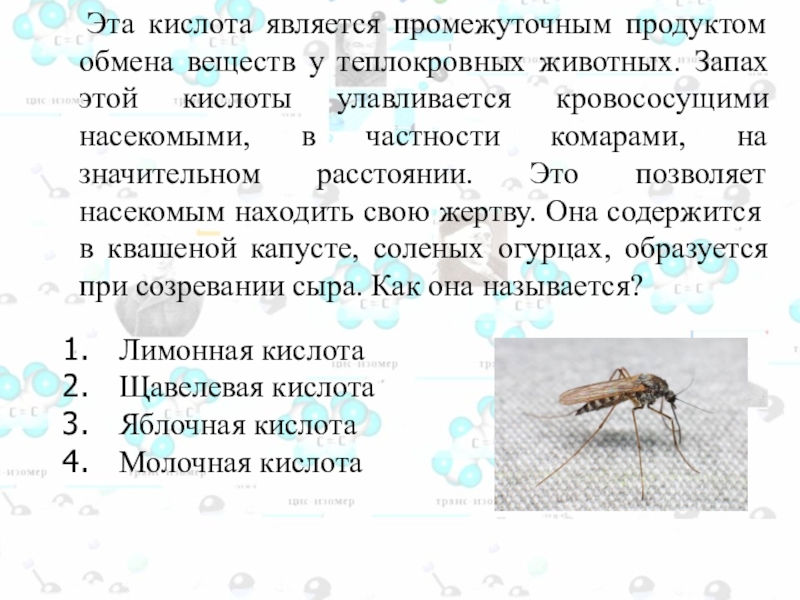 животных. Запах этой кислоты улавливается кровососущими насекомыми, в частности комарами, на значительном расстоянии. Это позволяет насекомым находить свою жертву. Она содержится в квашеной капусте, соленых огурцах, образуется при созревании сыра. Как она называется?