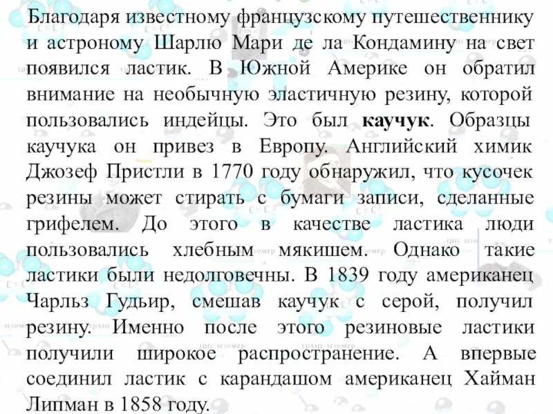 ла Кондамину на свет появился ластик. В Южной Америке он обратил внимание на необычную эластичную резину, которой пользовались индейцы. Это был каучук. Образцы каучука он привез в Европу. Английский химик Джозеф Пристли в 1770 году обнаружил, что кусочек резины может стирать с бумаги записи, сделанные грифелем. До этого в качестве ластика люди пользовались хлебным мякишем. Однако такие ластики были недолговечны. В 1839 году американец Чарльз Гудьир, смешав каучук с серой, получил резину. Именно после этого резиновые ластики получили широкое распространение. А впервые соединил ластик с карандашом американец Хайман Липман в 1858 году.