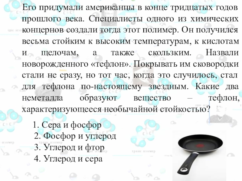 Специалисты одного из химических концернов создали тогда этот полимер. Он получился весьма стойким к высоким температурам, к кислотам и щелочам, а также скользким. Назвали новорожденного «тефлон». Покрывать им сковородки стали не сразу, но тот час, когда это случилось, стал для тефлона по-настоящему звездным. Какие два неметалла образуют вещество – тефлон, характеризующееся необычайной стойкостью?