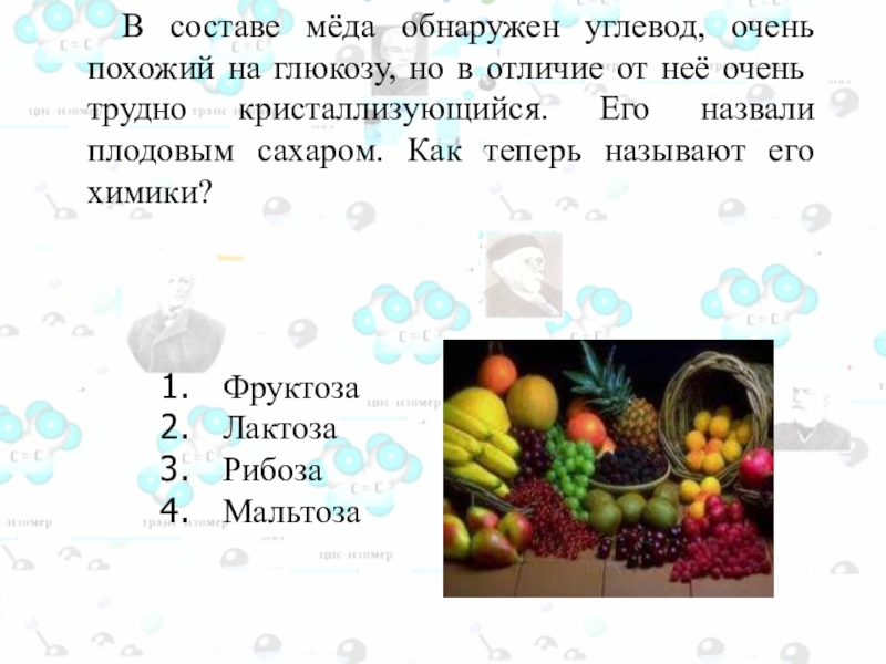 Слайд 100 В составе мёда обнаружен углевод, очень похожий на глюкозу,