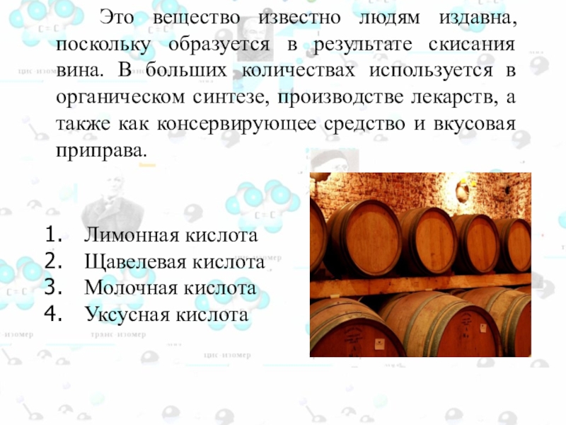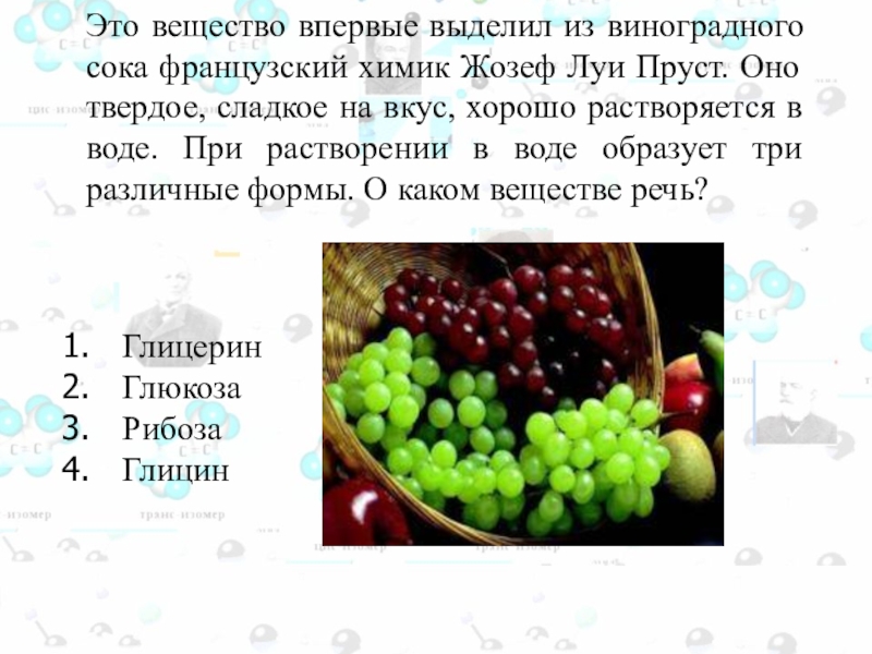 Слайд 97 Это вещество впервые выделил из виноградного сока французский химик
