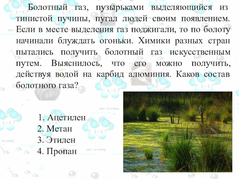 Слайд 6 Болотный газ – это метан, образующийся при разложении органических