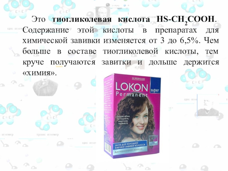 в препаратах для химической завивки изменяется от 3 до 6,5%. Чем больше в составе тиогликолевой кислоты, тем круче получаются завитки и дольше держится «химия».