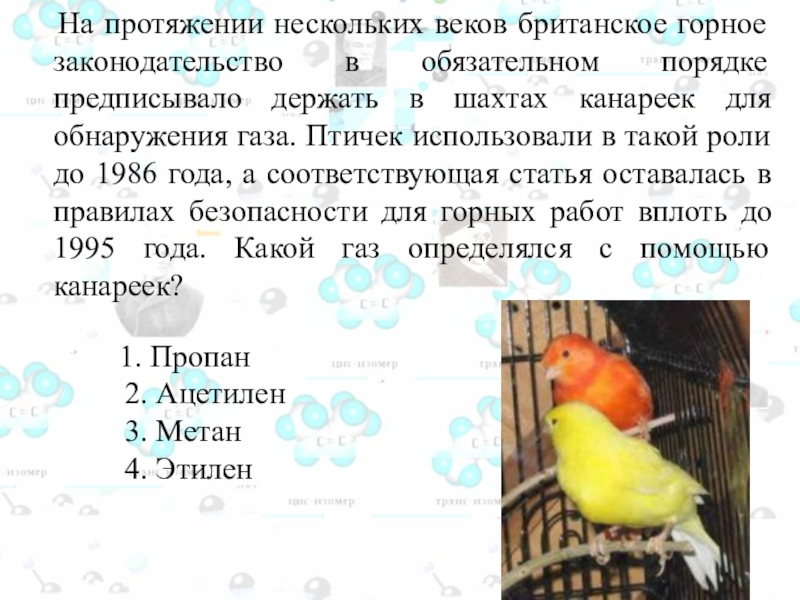 порядке предписывало держать в шахтах канареек для обнаружения газа. Птичек использовали в такой роли до 1986 года, а соответствующая статья оставалась в правилах безопасности для горных работ вплоть до 1995 года. Какой газ определялся с помощью канареек?