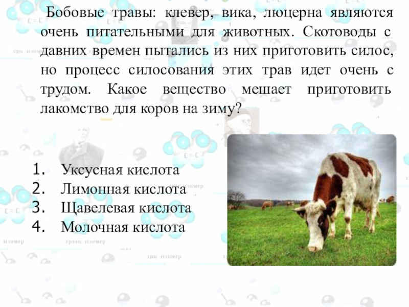 животных. Скотоводы с давних времен пытались из них приготовить силос, но процесс силосования этих трав идет очень с трудом. Какое вещество мешает приготовить лакомство для коров на зиму?
