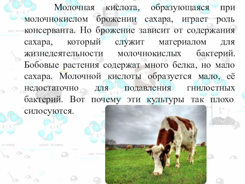 консерванта. Но брожение зависит от содержания сахара, который служит материалом для жизнедеятельности молочнокислых бактерий. Бобовые растения содержат много белка, но мало сахара. Молочной кислоты образуется мало, её недостаточно для подавления гнилостных бактерий. Вот почему эти культуры так плохо силосуются.