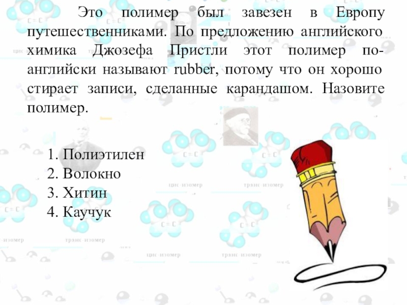 английского химика Джозефа Пристли этот полимер по-английски называют rubber, потому что он хорошо стирает записи, сделанные карандашом. Назовите полимер.
