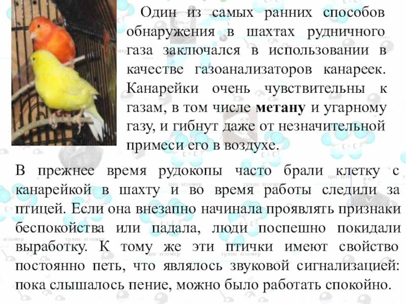 газа заключался в использовании в качестве газоанализаторов канареек. Канарейки очень чувствительны к газам, в том числе метану и угарному газу, и гибнут даже от незначительной примеси его в воздухе.